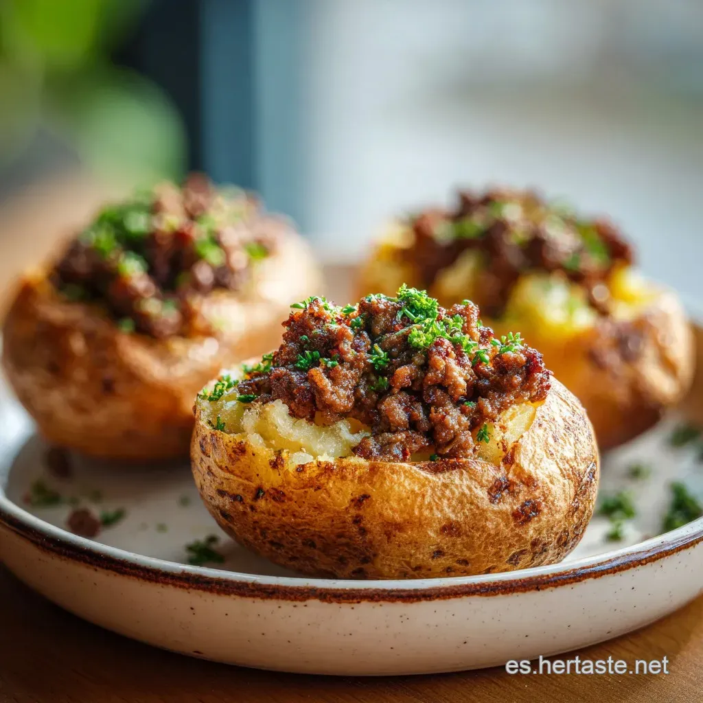 La presentación de las papas rellenas con carne es lo que las eleva de comida callejera a plato estrella. Sírvelas sobre una cama de hojas verdes frescas para dar un contraste de color vibrante.