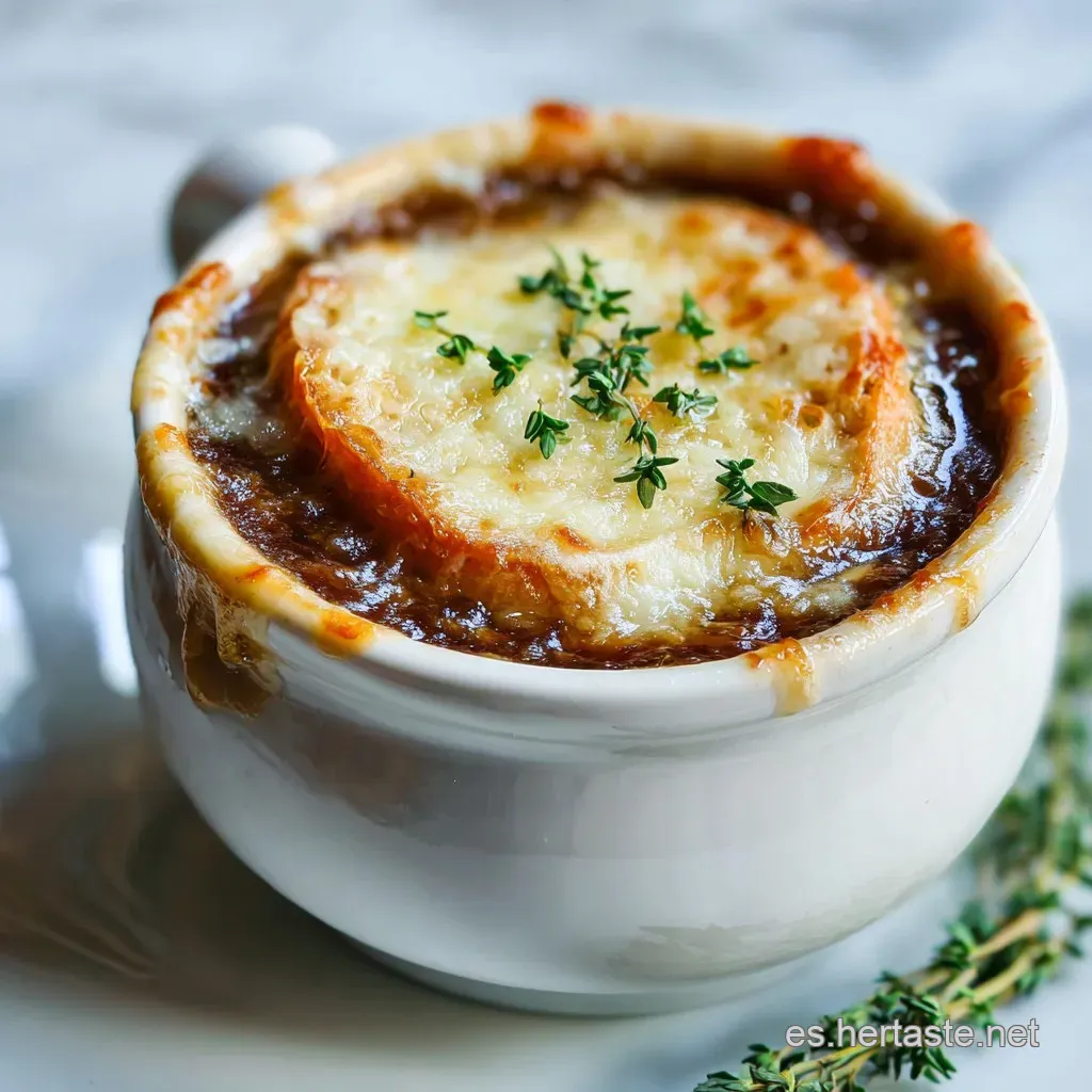 Sustituye el Gruyère por un queso Manchego curado y añade unos cubitos de jamón serrano crujiente al final. Cambia el tomillo por una pizca de pimentón de la Vera para una sopa de cebolla con alma española.